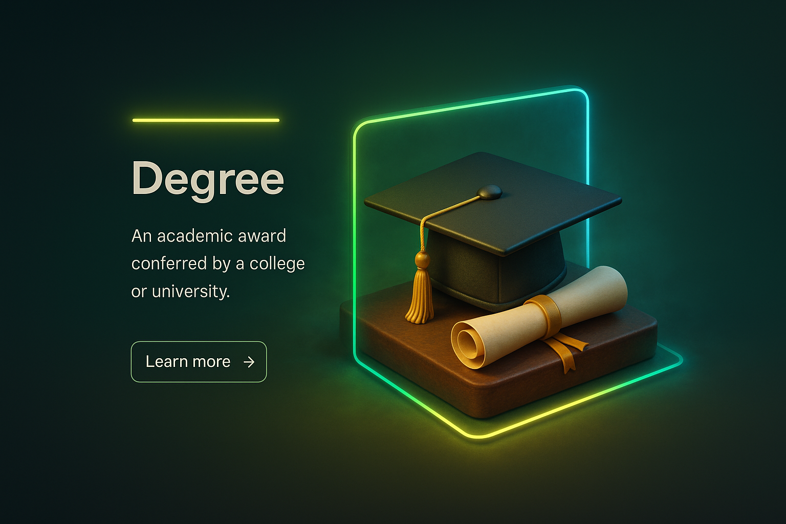 A visually striking 3D representation of a graduation degree, featuring a black cap and rolled diploma. The scene includes neon accents and a dark gradient background, creating a magical atmosphere.