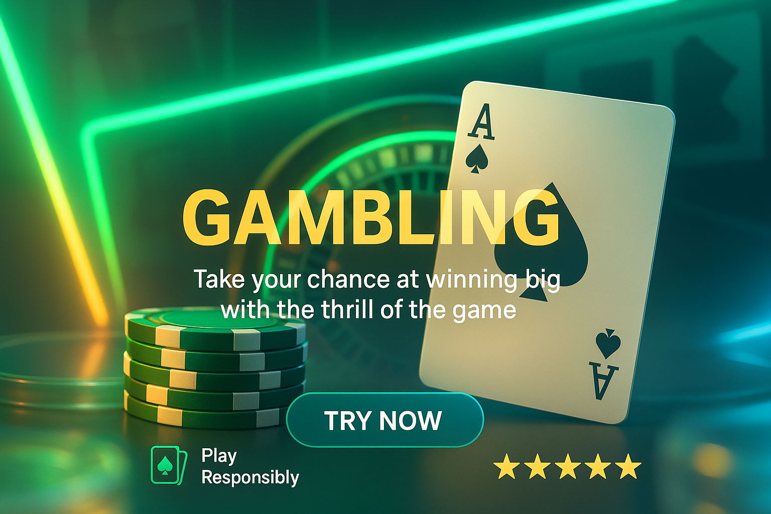 Promotional Gambling Advertisement Featuring Playing Cards and Chips