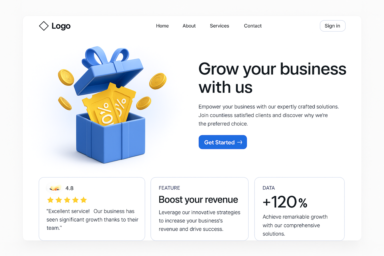 A visually appealing 3D landing page featuring a gift box with coupons and flying coins. It includes sections for features, testimonials, and revenue data.