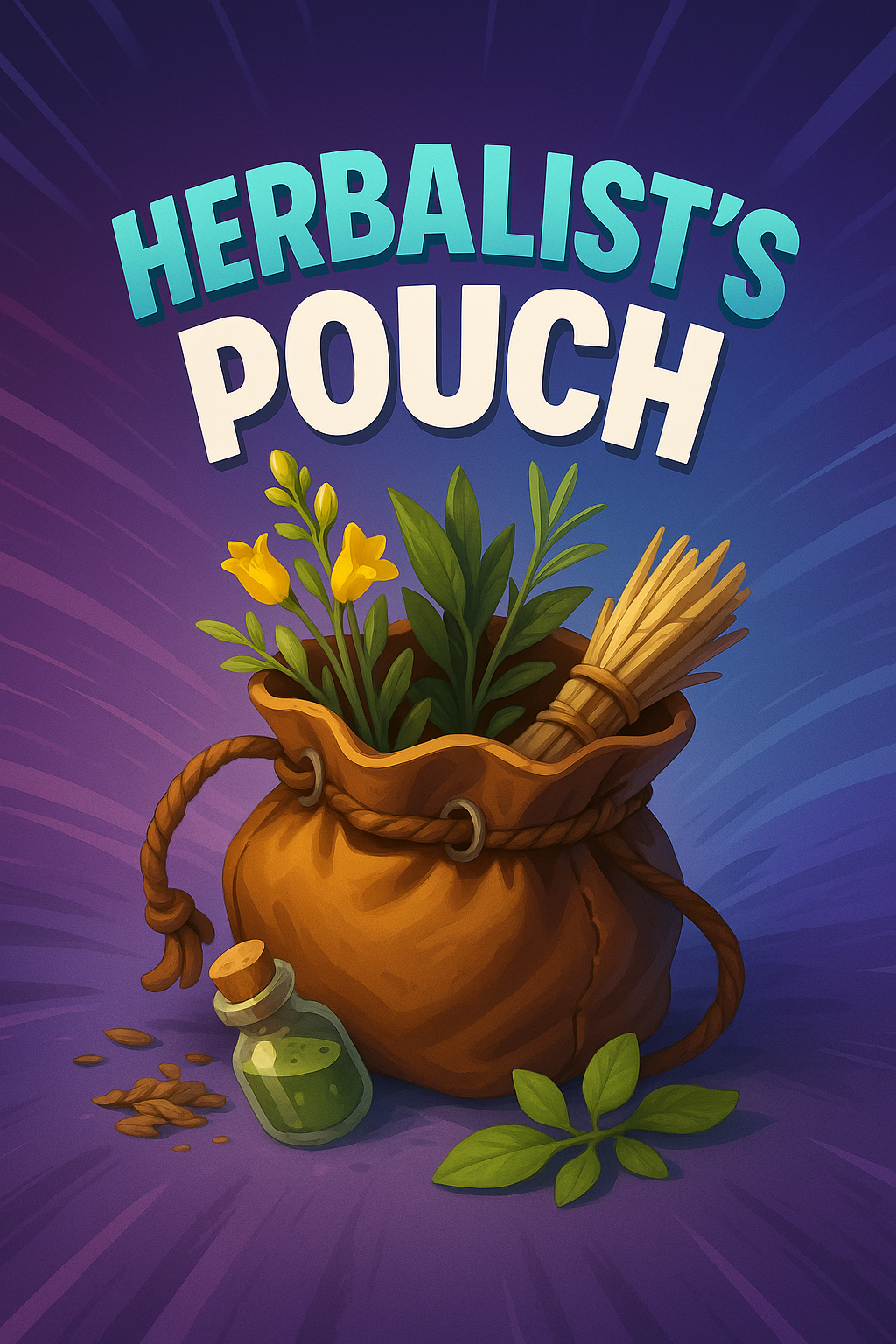 A vibrant illustration of a herbalist's pouch filled with plants and herbs, set against a dynamic gradient background. The title 'HERBALIST'S POUCH' features bold, engaging typography.