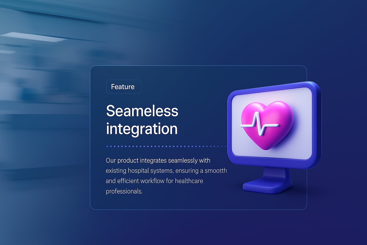 A motion blurred photograph of a hospital interior featuring a 3D illustration of a monitor with a heart symbol. The design includes a cohesive feature block for healthcare integration.