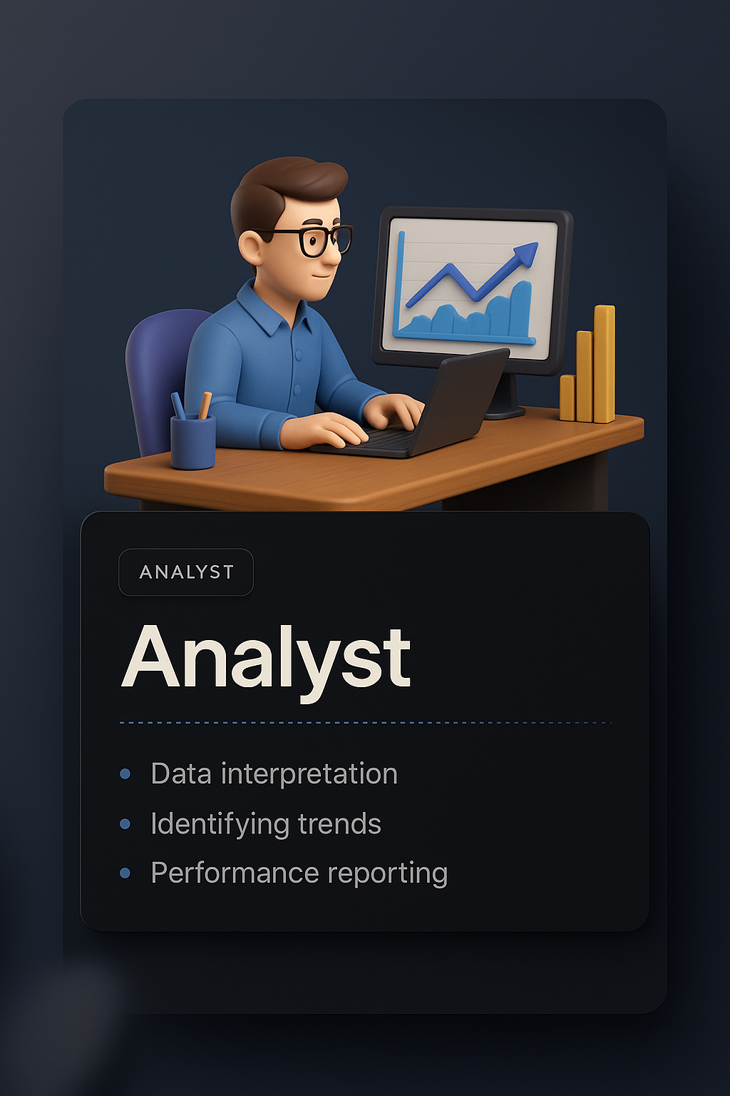 /Collection: /by davooda/Type: PNG/A professional 3D illustration of an analyst working at a desk. The design features a dark panel with text, a computer displaying graphs, and various data elements, all seamlessly integrated.
