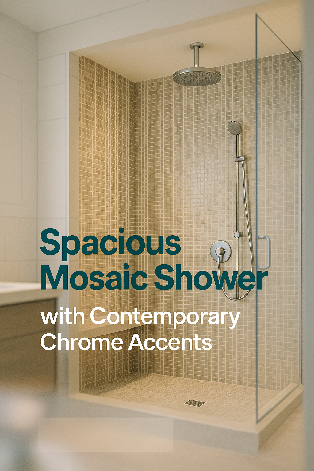 /Collection: /by davooda/Type: PNG/Elegant bathroom image showcasing a spacious mosaic shower with chrome accents, ideal for home renovation inspiration and interior design projects.