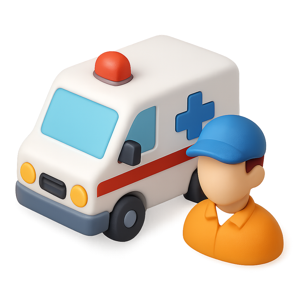 A stylized 3D ambulance icon featuring a driver in a blue cap. The ambulance has a red cross and light on top, rendered in a three-quarter isometric view.