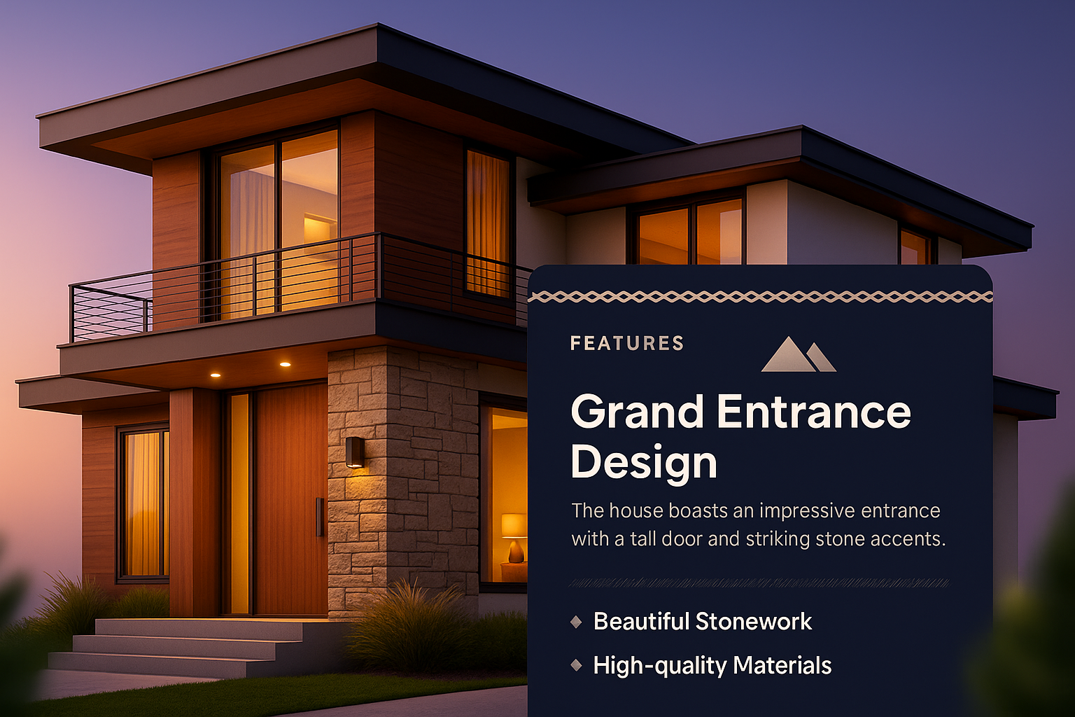 This image features a beautifully crafted modern house with a striking facade. The design highlights a grand entrance, emphasizing quality materials and elegant details.