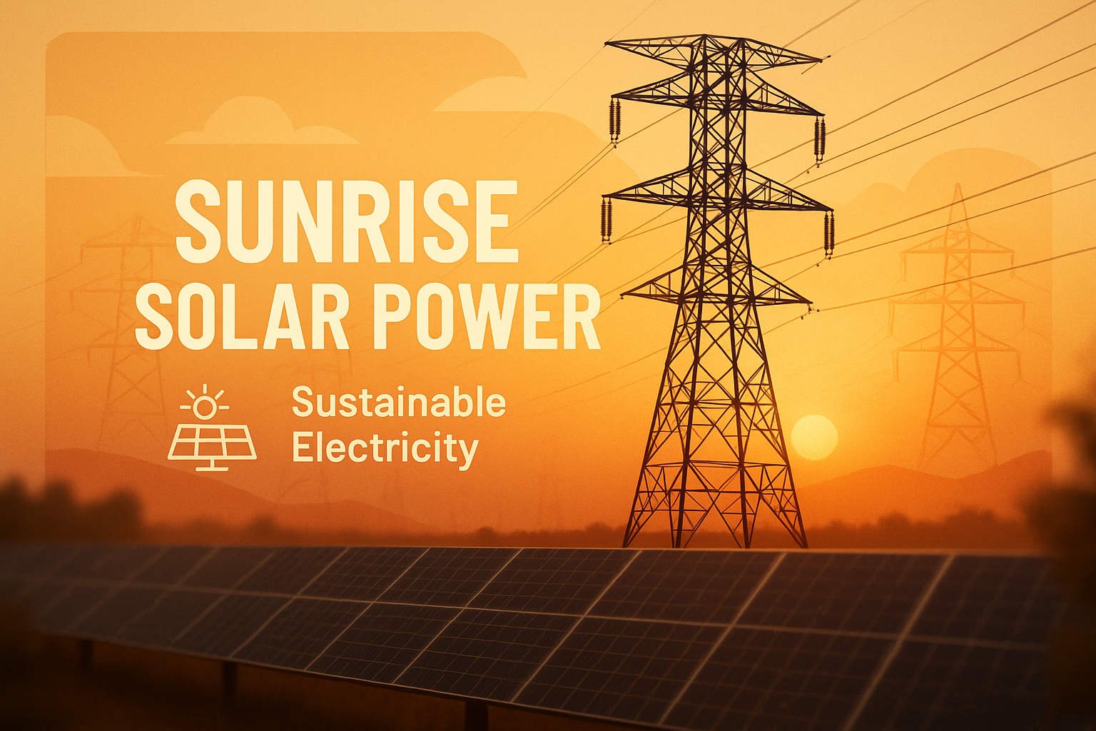 /Collection: /by davooda/Type: PNG/A visually striking image depicting solar panels and power lines against a vibrant sunrise backdrop, symbolizing sustainable energy solutions. Ideal for renewable energy campaigns.
