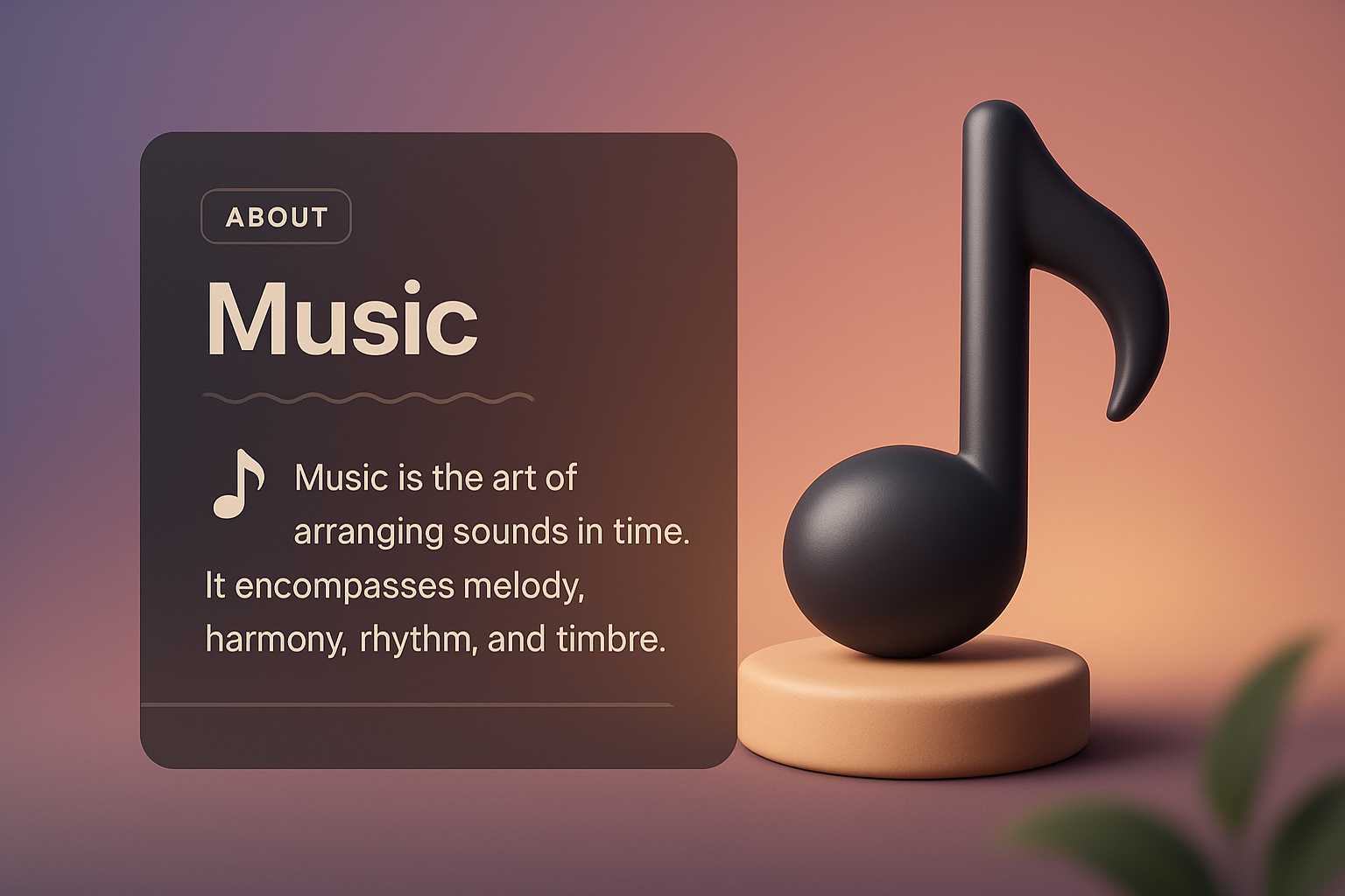 A stylized 3D music note stands on a circular base against a gradient background. The design includes a dark informational block with text about music's essence.