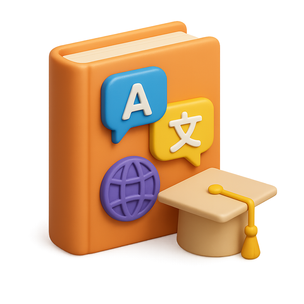 /Collection: /by davooda/Type: PNG/A colorful 3D icon depicting a book, speech bubbles with letters, a globe, and a graduation cap. The design emphasizes language education in a playful, isometric style.