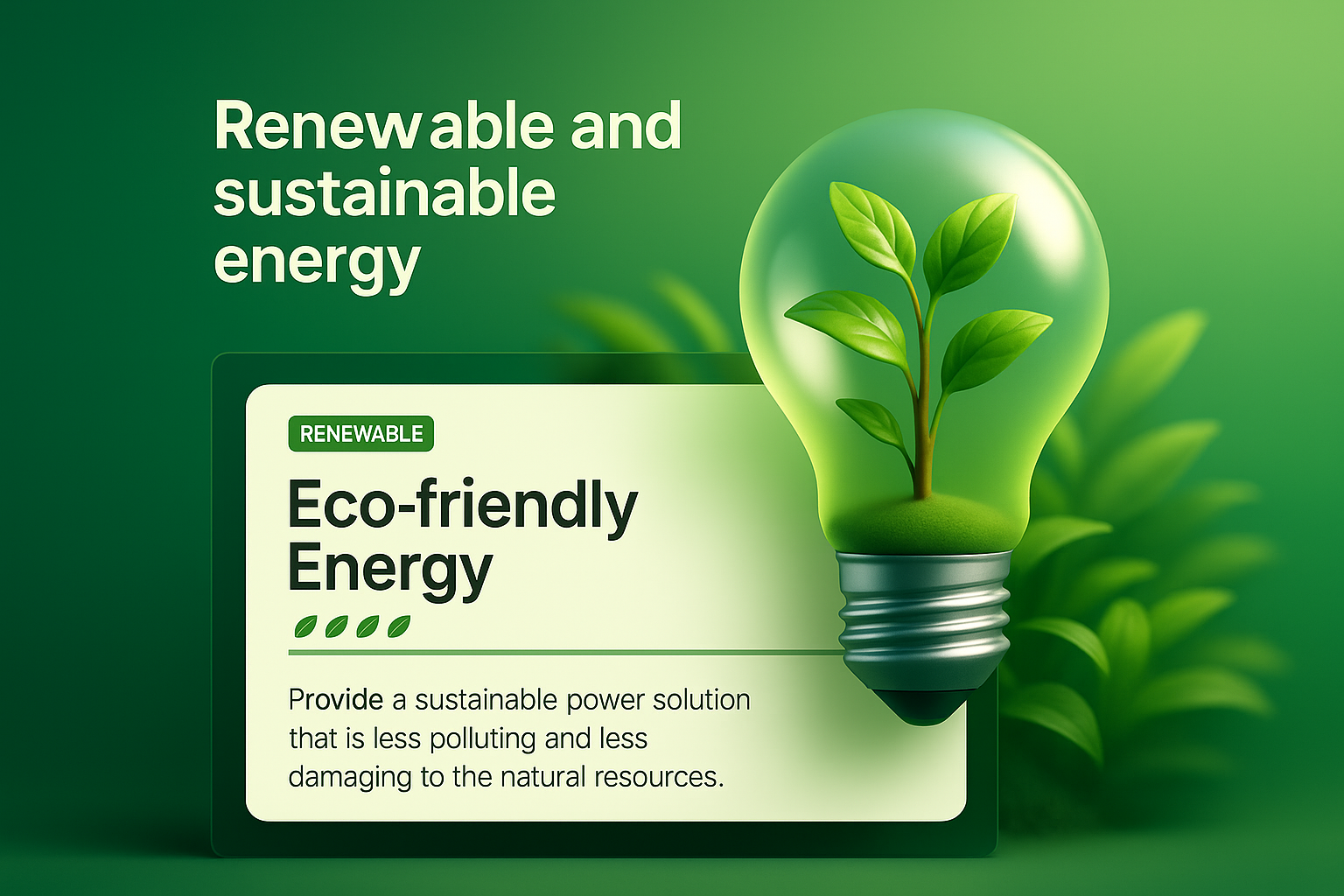 /Collection: /by davooda/Type: PNG/A 3D illustration of an eco-friendly lightbulb with a plant inside, set against a smooth green gradient background. The design emphasizes renewable energy with a modern and clean aesthetic.