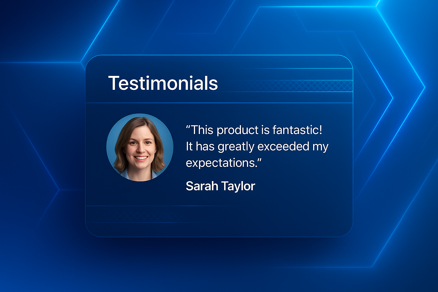 /Collection: /by davooda/Type: PNG/A modern testimonial block featuring a circular photo of a woman, her quote, and name. The backdrop is a blue gradient with glowing geometric lines, creating a futuristic look.