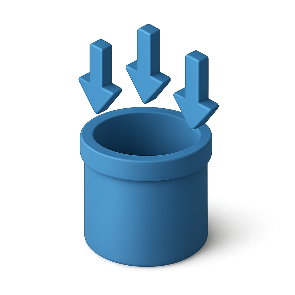 /Collection: /by davooda/Type: PNG/This image features a 3D container icon depicted in a three-quarter view. It has a smooth, blue surface and three downward arrows above it, giving a sense of action or input.