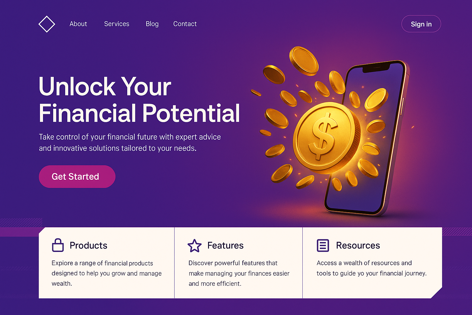 /Collection: /by davooda/Type: PNG/A visually appealing landing page featuring a gold coin, vibrant colors, and a sleek design. The layout includes product features and resources, inviting users to explore financial solutions.