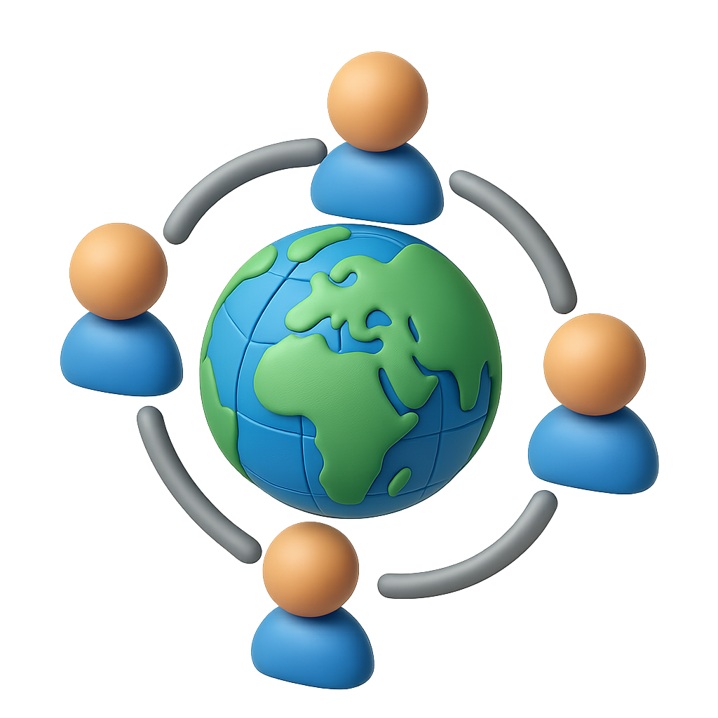 A visually engaging 3D icon depicting people connected around a globe, symbolizing global unity. The design features a transparent background with a vibrant earth and stylized figures.