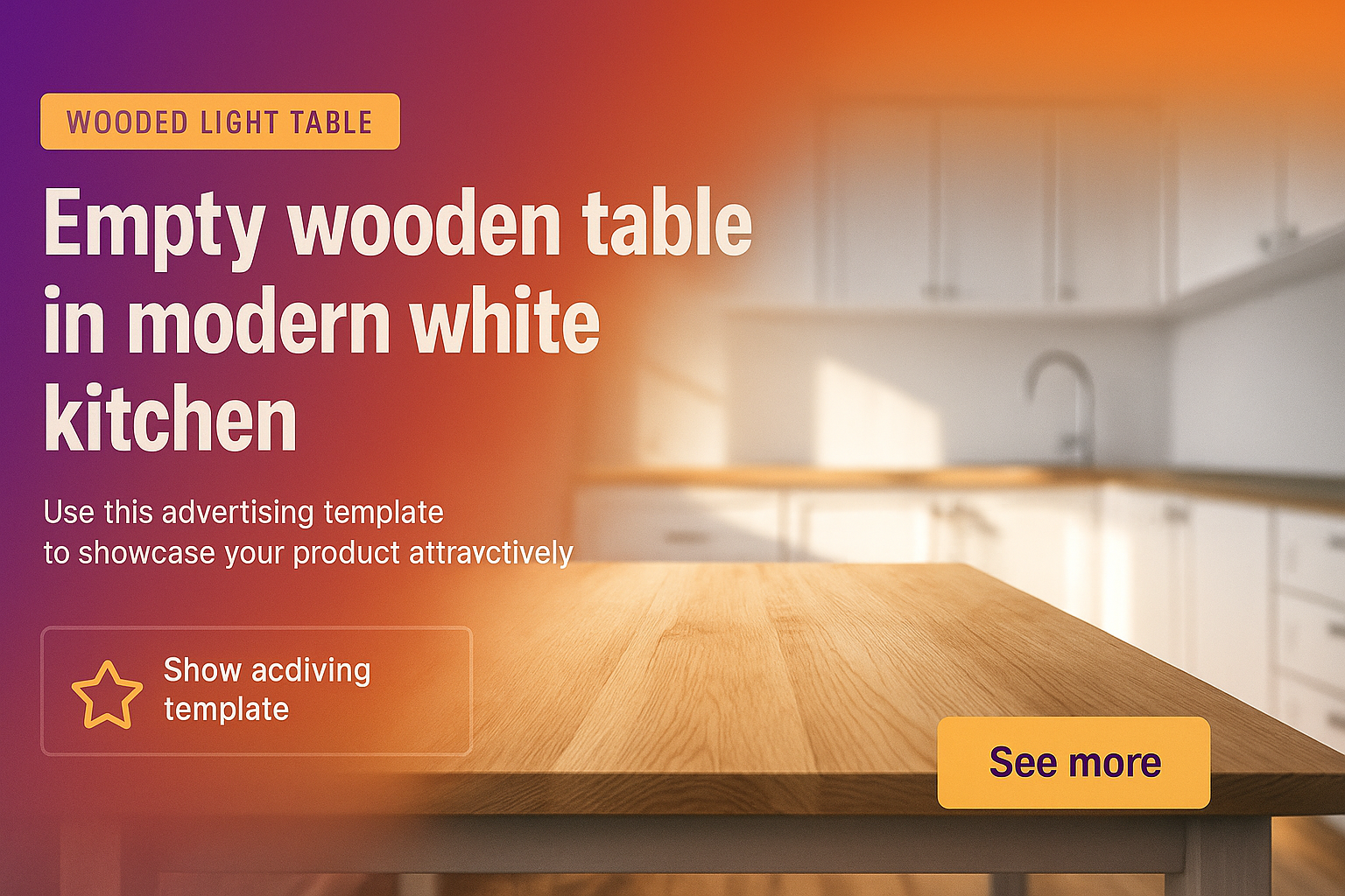 A beautifully designed modern kitchen featuring an empty wooden table. The scene highlights a bright, minimalist interior, perfect for advertising products. Soft light enhances the ambiance.