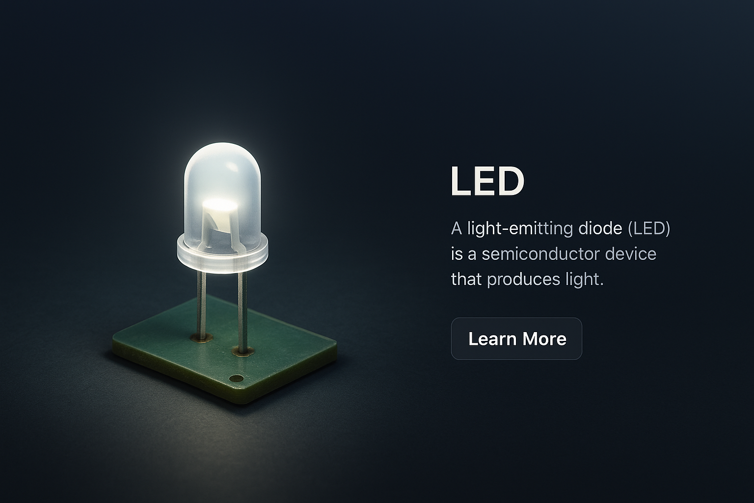 A detailed 3D illustration of an LED diode on a dark gradient background. The image captures the essence of the component with a clear label and action button, showcasing its features.