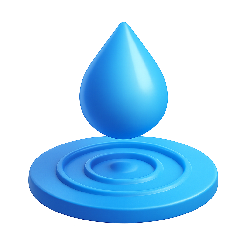 A vibrant blue 3D water droplet hovering above a circular base with concentric ripples. The design features a glossy finish and a smooth texture, enhancing its volumetric appearance.