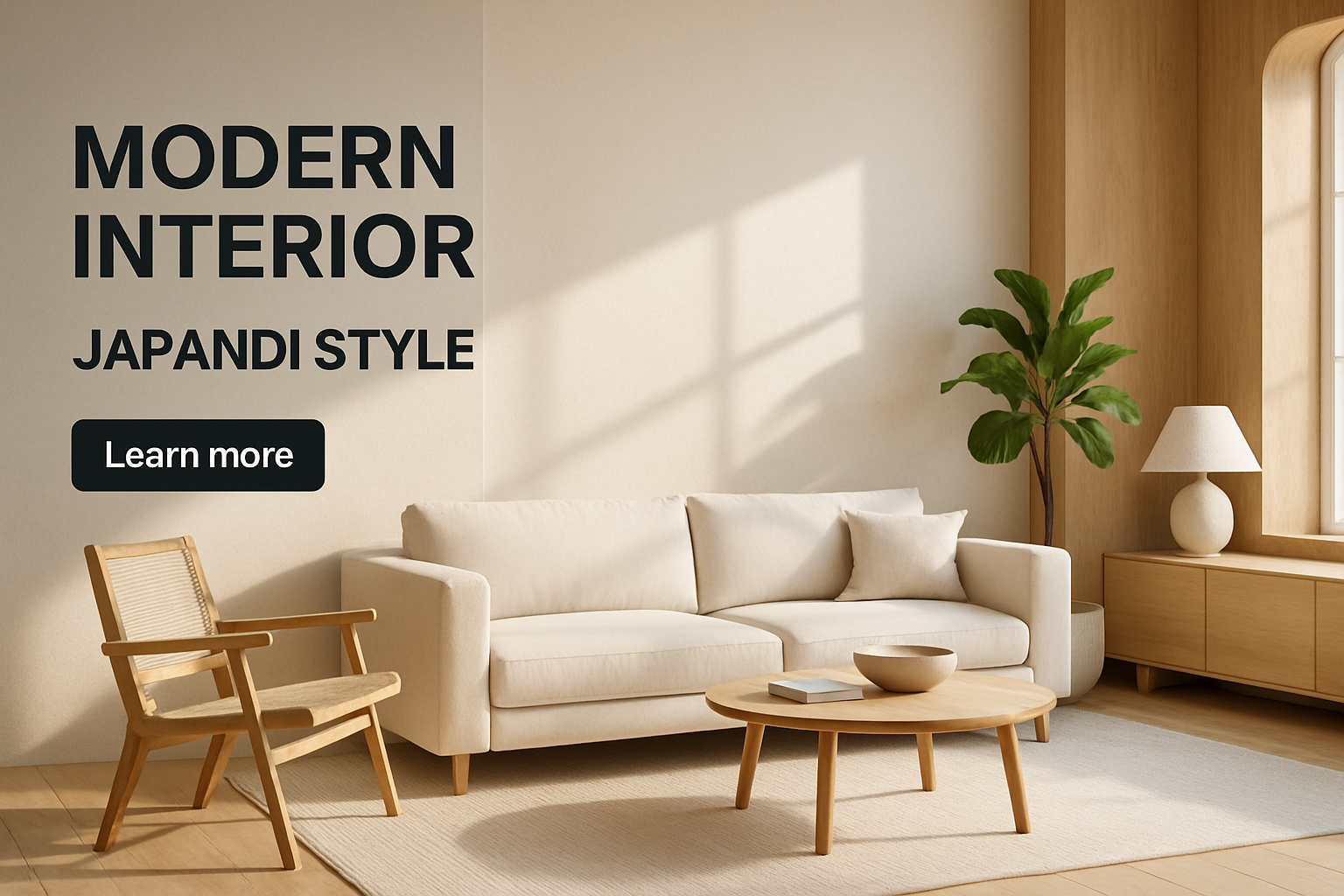 /Collection: /by davooda/Type: PNG/A beautifully designed Japandi living room featuring a cozy sofa, wooden furniture, and natural light. The composition includes bold typography and a call-to-action button, emphasizing modern design.
