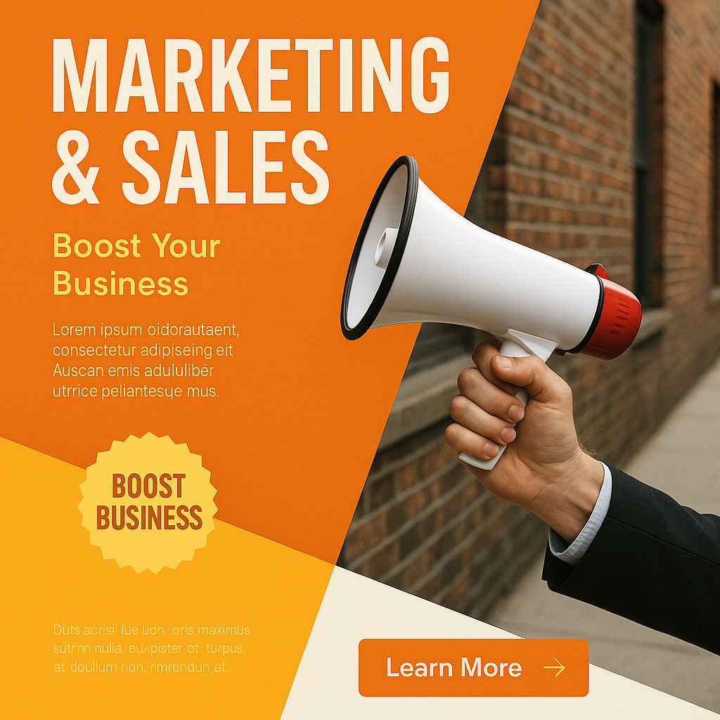 An engaging image featuring a hand holding a megaphone against an orange background, highlighting marketing and sales themes. Bold text emphasizes action.
