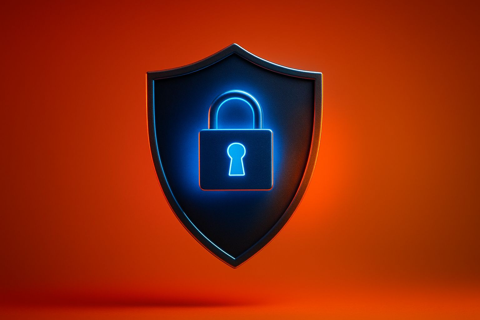 /Collection: /by davooda/Type: PNG/A striking representation of cyber security, featuring a shield with a padlock symbol. The vibrant backdrop enhances the shield's illuminated design, emphasizing data protection.