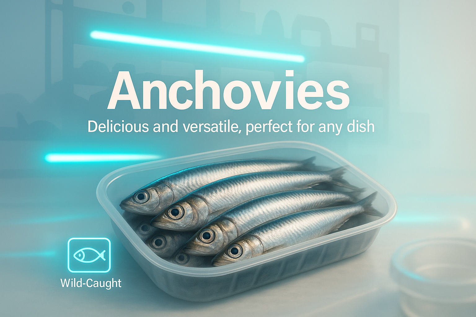 /Collection: /by davooda/Type: PNG/A visually appealing promotional image showcasing fresh wild-caught anchovies in a plastic tray. The design emphasizes culinary versatility with modern styling, suitable for food marketing.