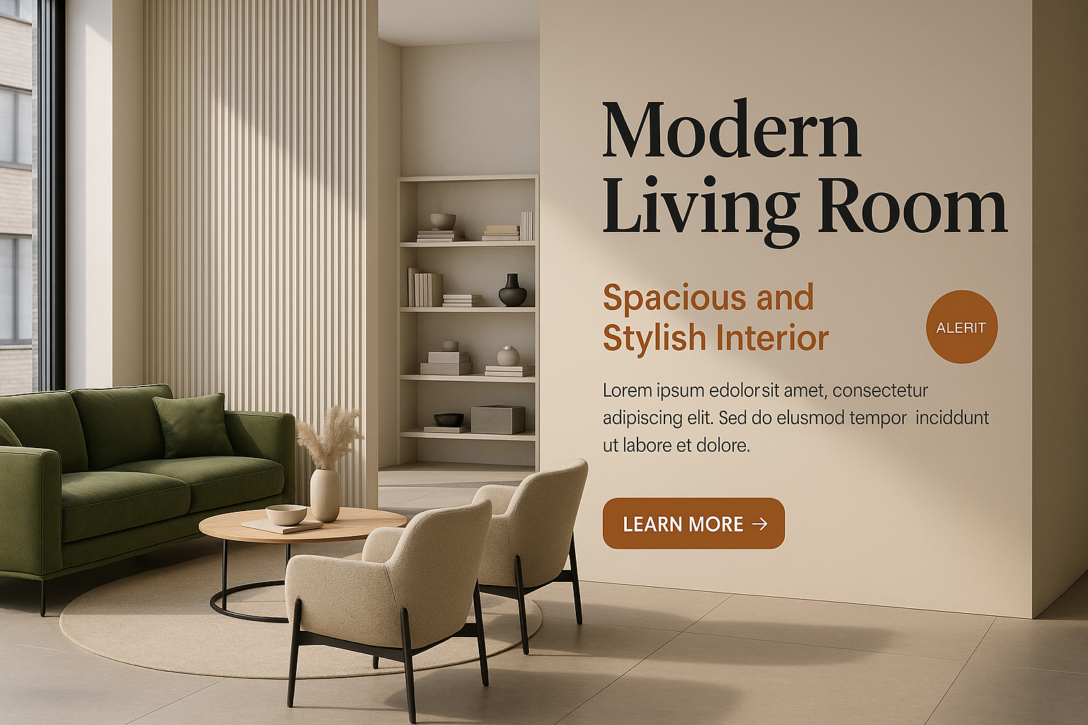 /Collection: /by davooda/Type: PNG/A spacious modern living room featuring a green sofa, armchairs, and a coffee table. The design emphasizes realism with layered compositions and a clean aesthetic.