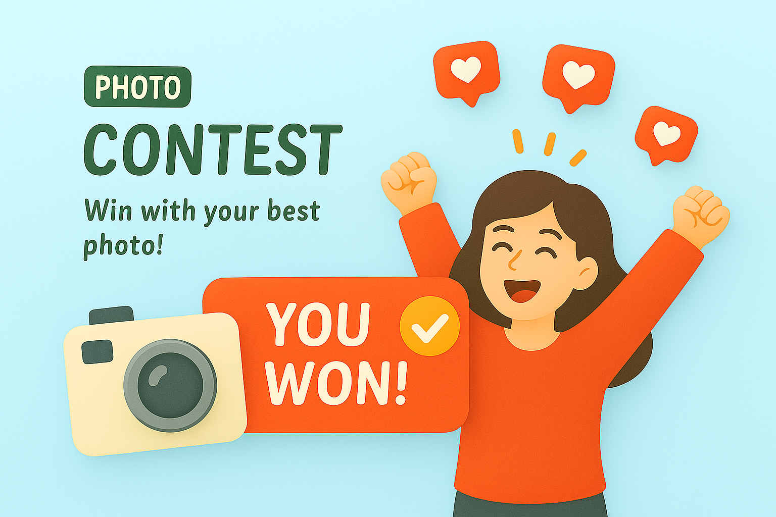 Vibrant promotional graphic for a photo contest featuring a joyful character celebrating a win, ideal for social media engagement.