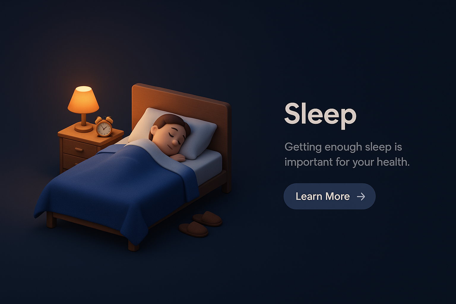 A detailed 3D scene depicting a cozy bedroom with a sleeping figure, bedside lamp, and clock. The dark background enhances the calming atmosphere, emphasizing the importance of sleep.