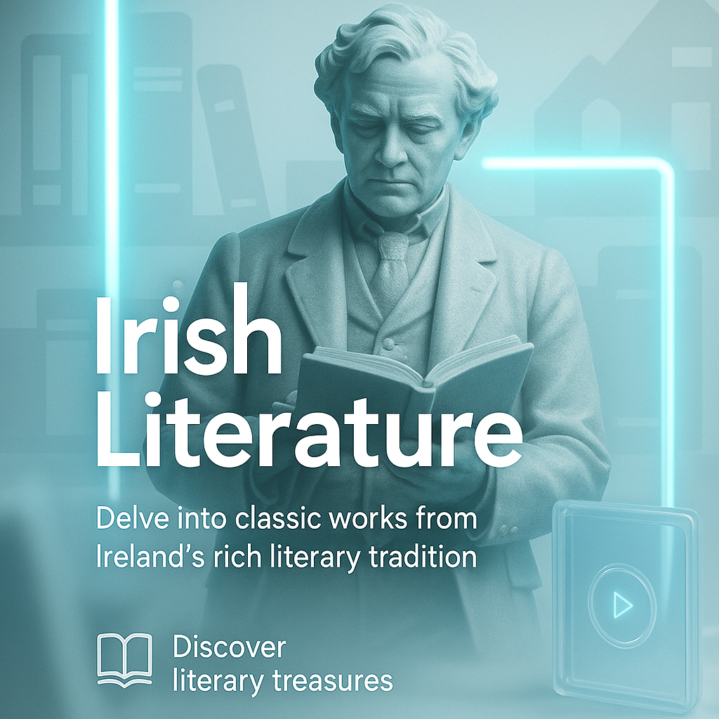 Engaging promotional image featuring a statue reading a book, highlighting classic Irish literature. Ideal for educational content or literary discussions.