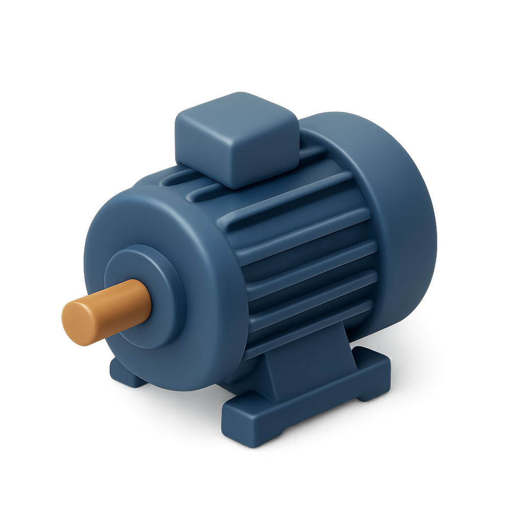 A stylized 3D icon of an electric motor, depicted in a three-quarter view with a transparent background. The motor features a cylindrical body and a copper-colored shaft, showcasing a modern and sleek design.
