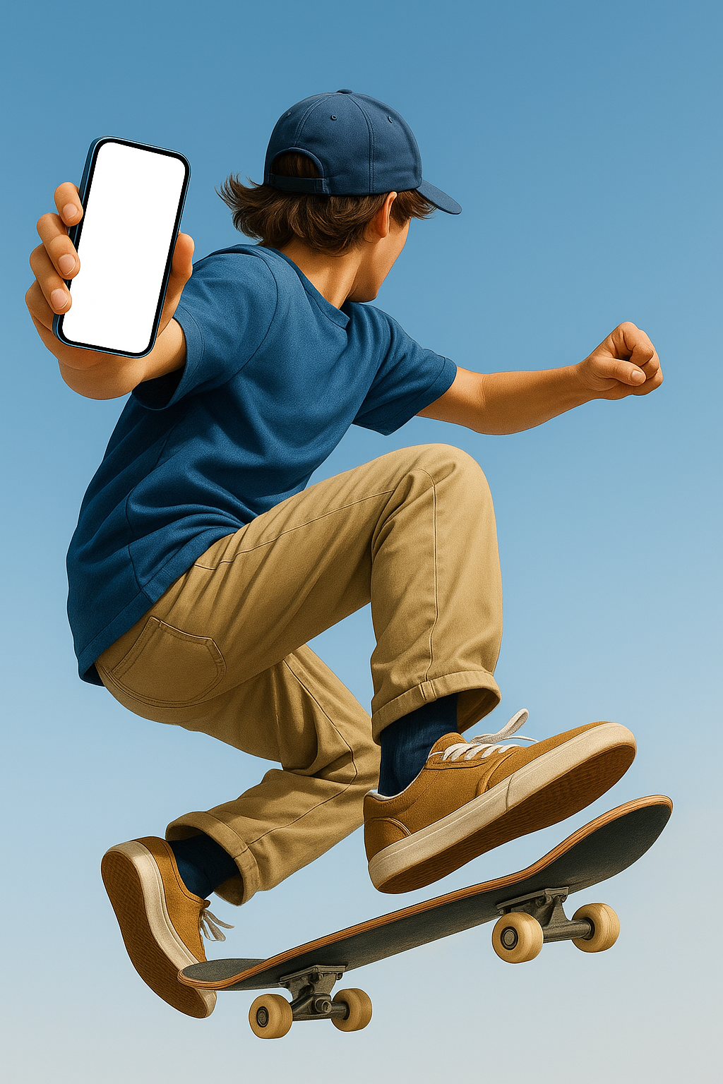 A dynamic shot of a teenager skateboarding mid-air while holding a blue phone. The image captures the excitement and energy of the moment against a clear blue sky.