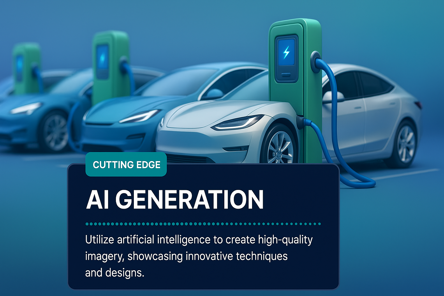 A line of electric cars at a public charging station with a focus on AI-generated imagery. The scene captures modern design and innovation in electric vehicle technology.