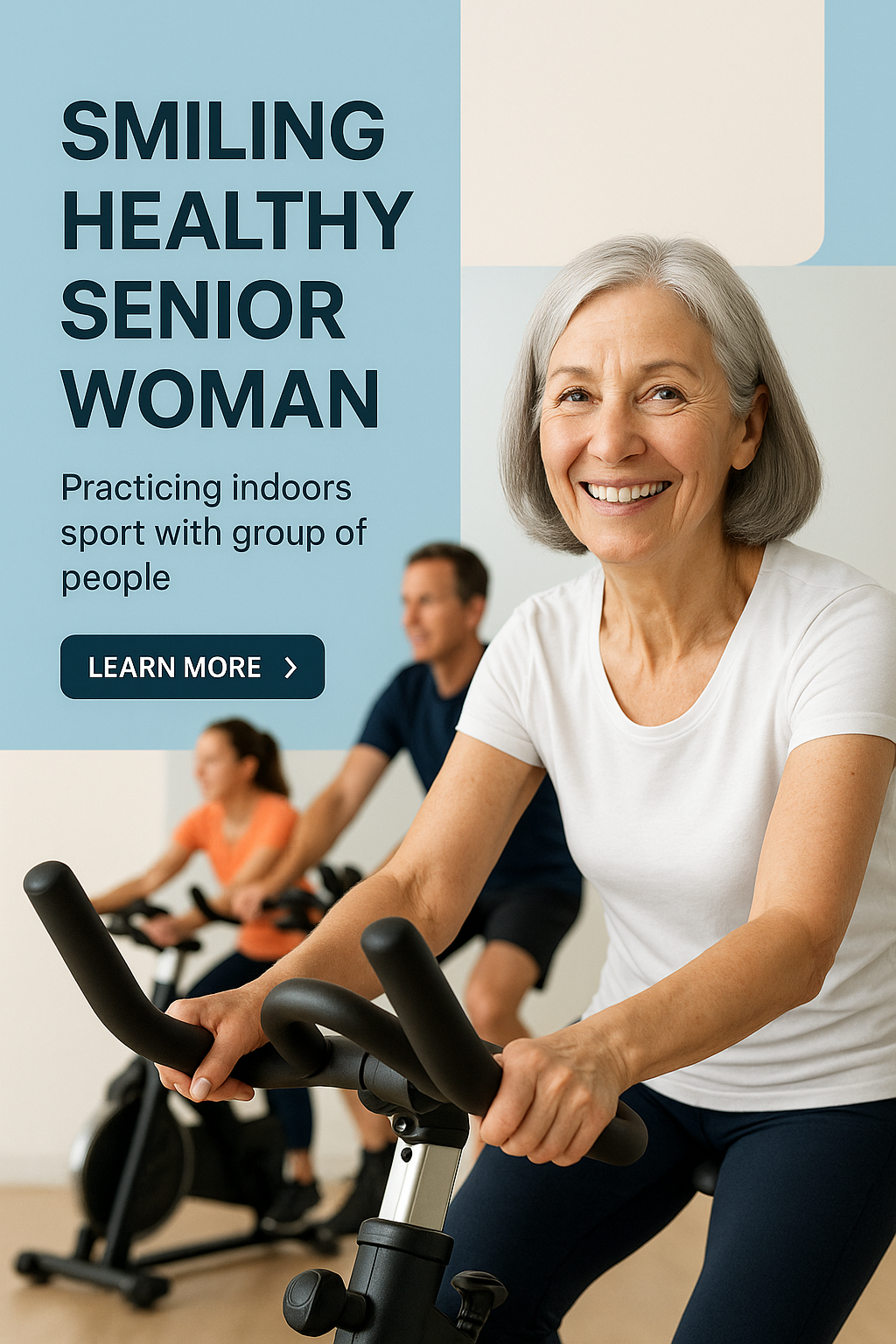 A smiling senior woman with grey hair enjoys exercising on a bike in a gym. She is surrounded by a group, highlighting a healthy, active lifestyle. The backdrop features bright geometric shapes.