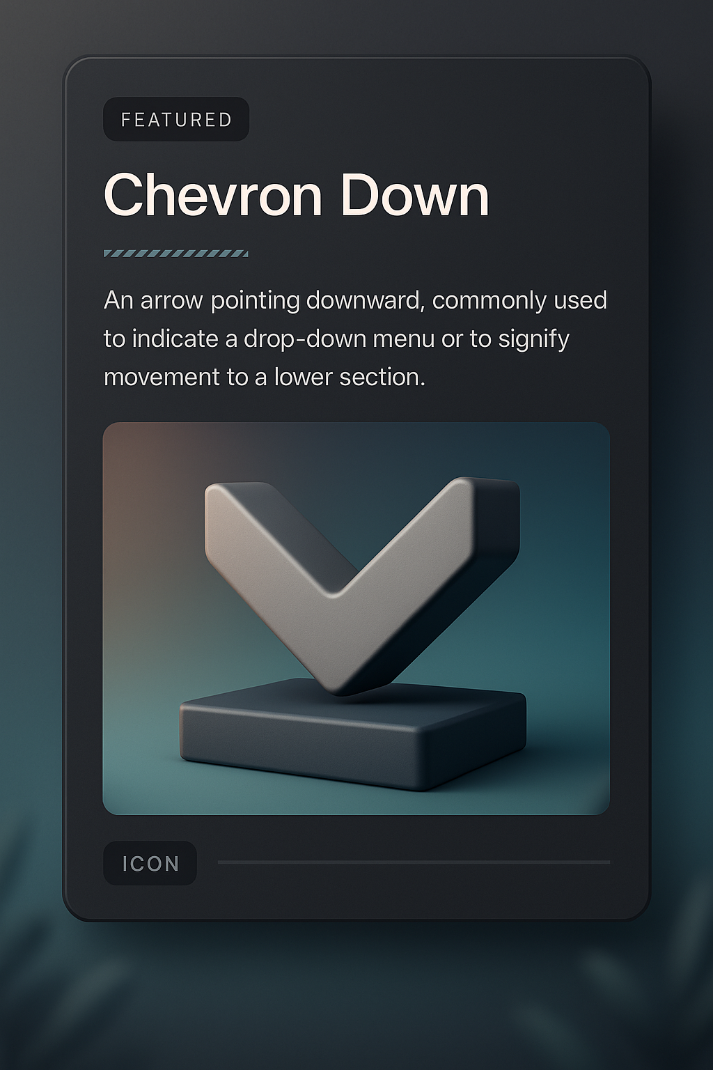 /Collection: /by davooda/Type: PNG/A sleek 3D icon of a chevron down on a subtle gradient background. The design features a dark panel with a title and description, integrating modern visual elements.