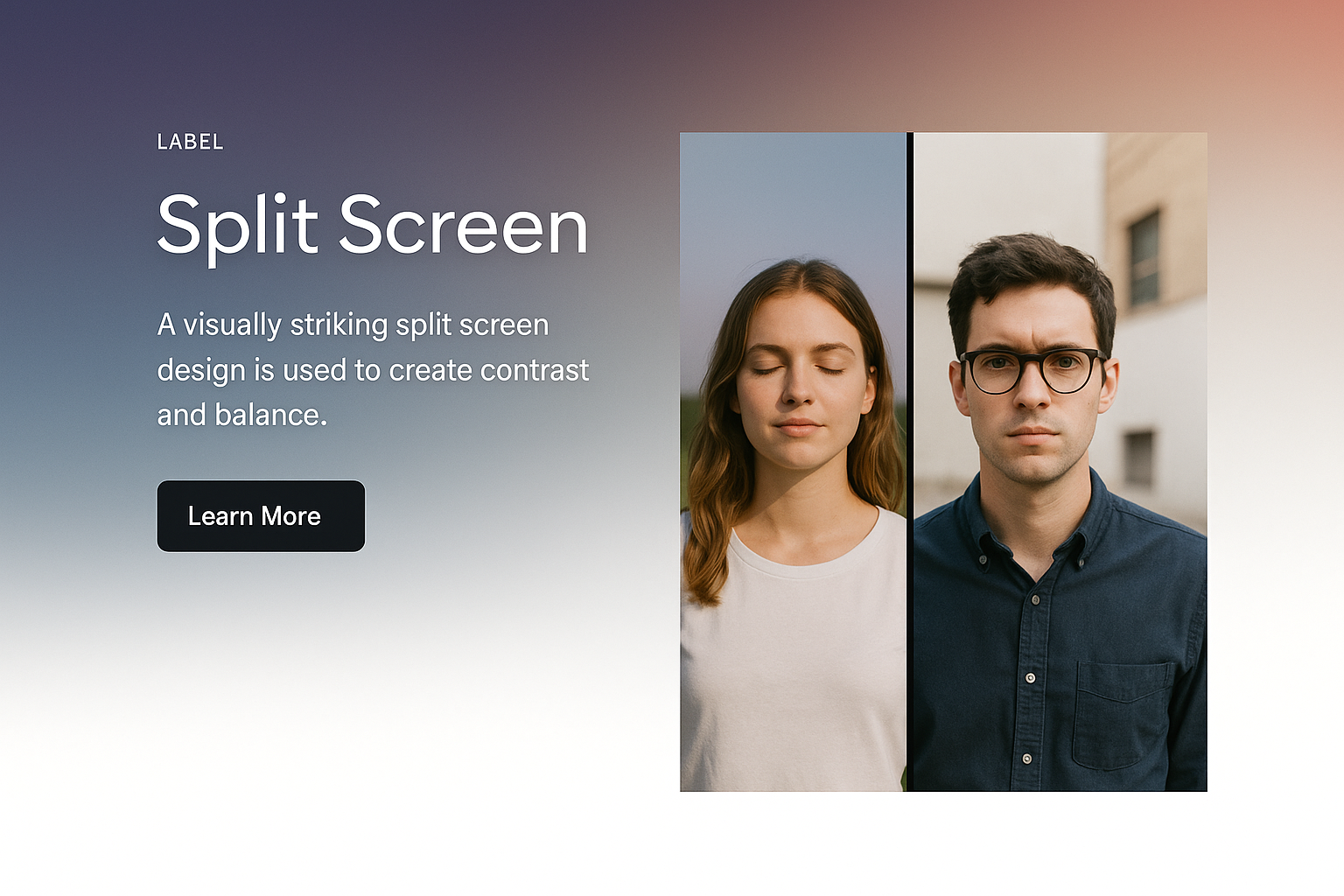 A stylish split screen web design featuring two individuals, one with eyes closed and the other looking directly at the viewer. The design utilizes a gradient background and clear text elements.
