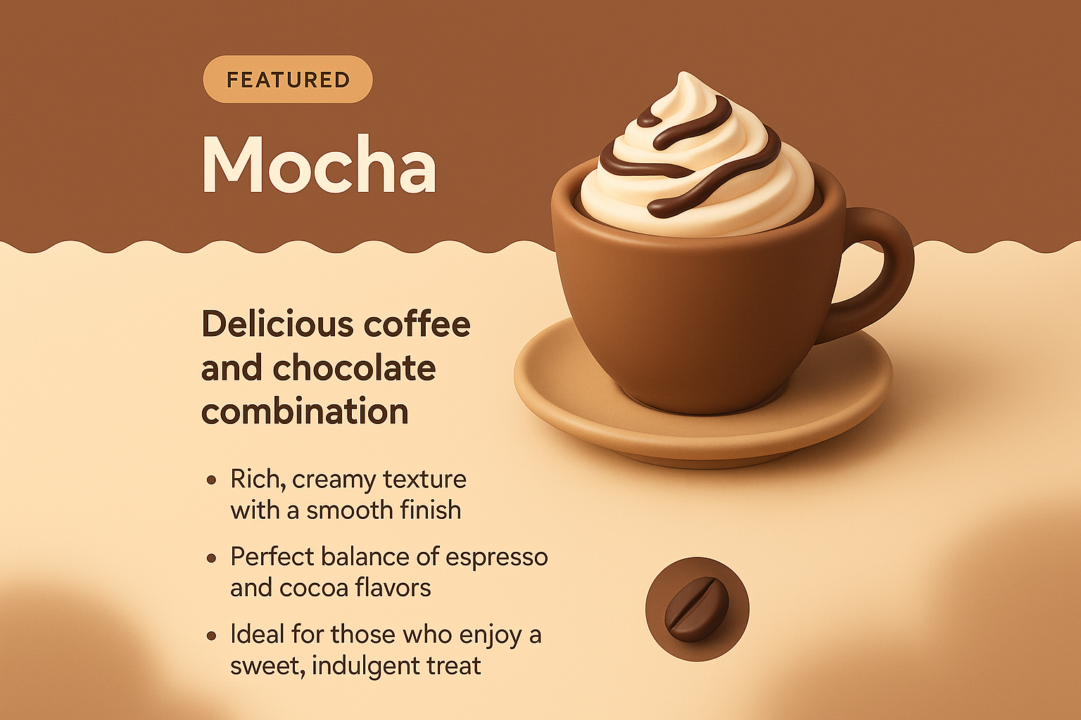 A visually appealing mocha-themed design featuring a 3D coffee cup with creamy texture. The layout includes a title, features, and an icon, all harmonized with a smooth gradient background.