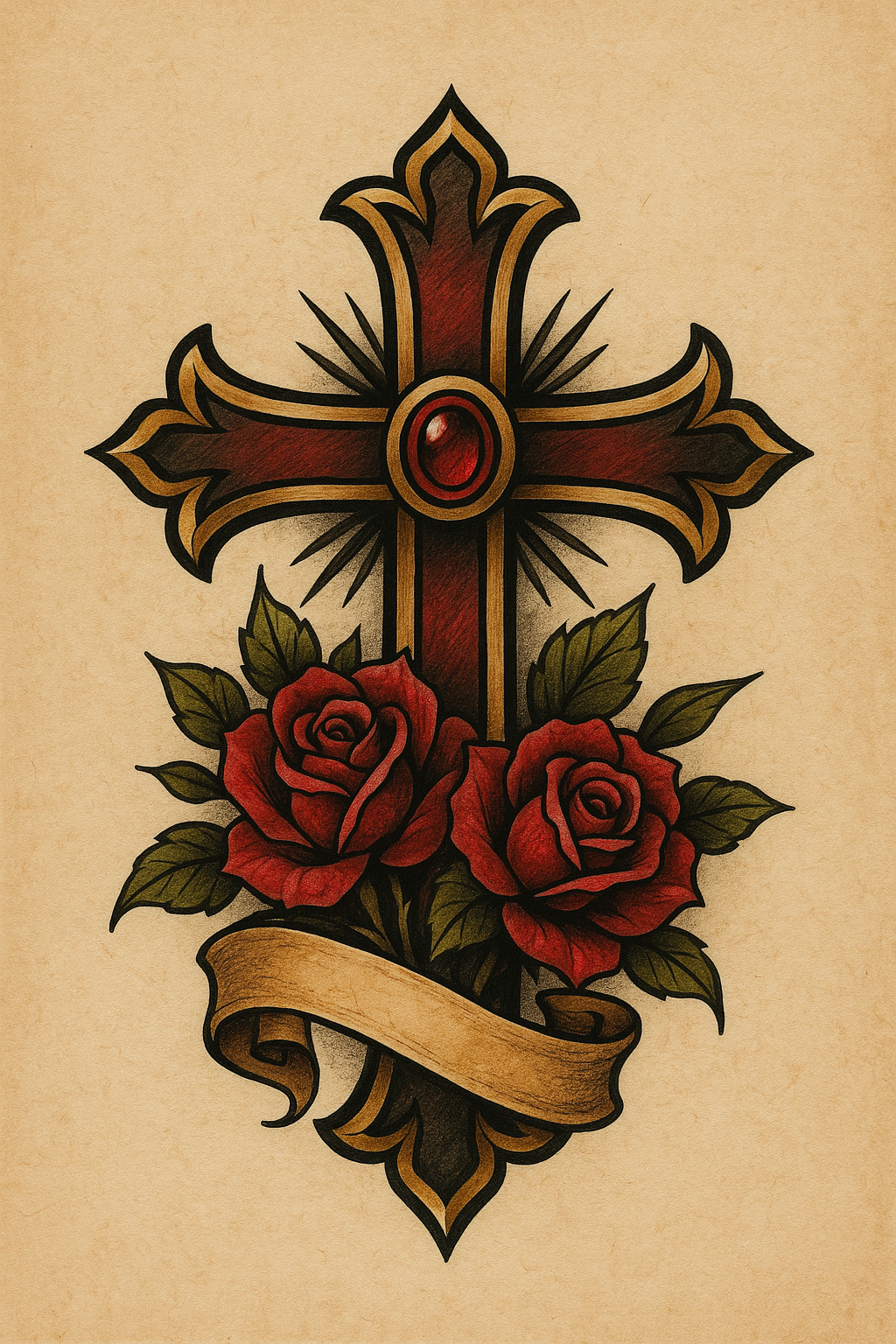 This image features a tattoo design showcasing a stylized cross adorned with red roses and a blank ribbon. Ideal for tattoo enthusiasts and artists.
