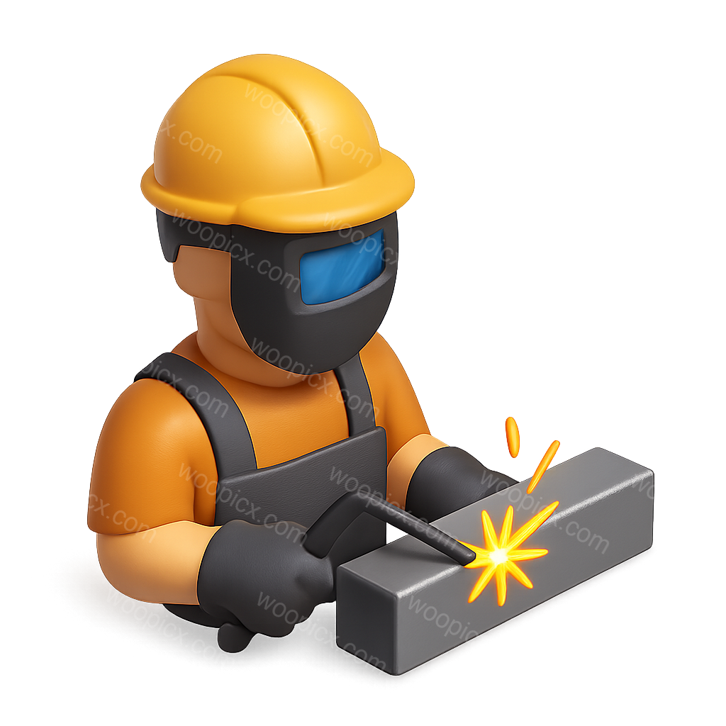 A stylized 3D icon of a metalworker in action, wearing safety gear and welding a metal piece, set against a soft gradient background.