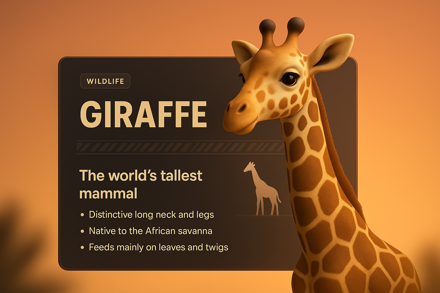 /Collection: /by davooda/Type: PNG/A striking 3D giraffe illustration set against a smooth gradient background. The design features an integrated informational block with details about the giraffe, enhancing the visual experience.