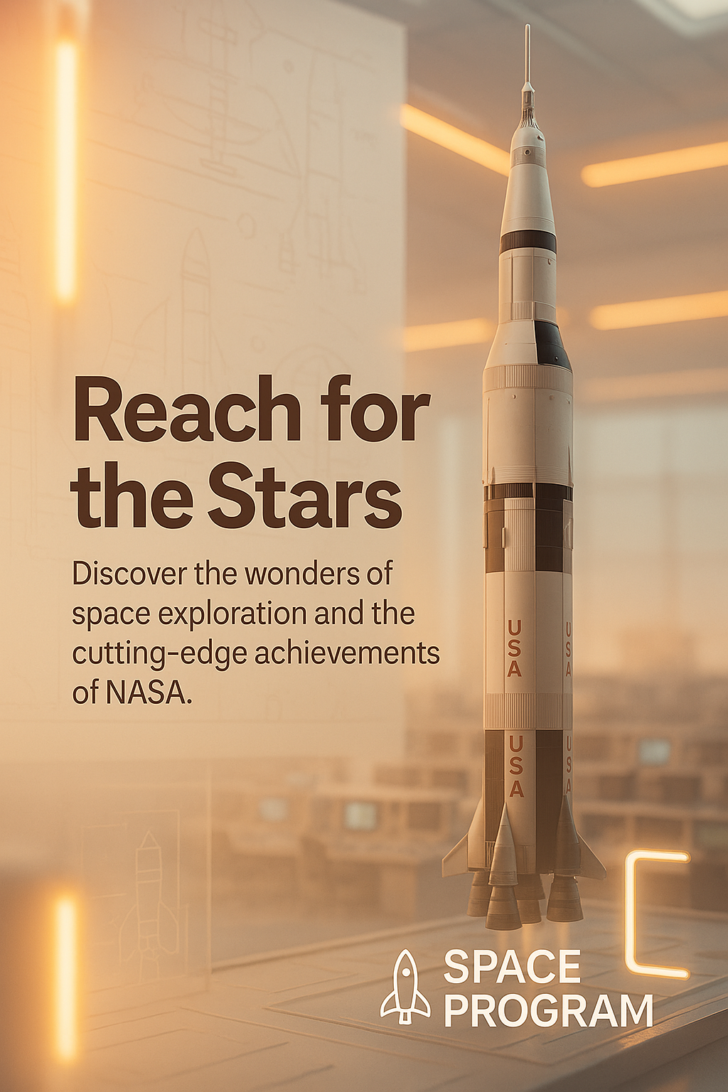 Visually striking promotional graphic showcasing a rocket model, emphasizing NASA's achievements in space exploration. Ideal for educational and marketing materials.