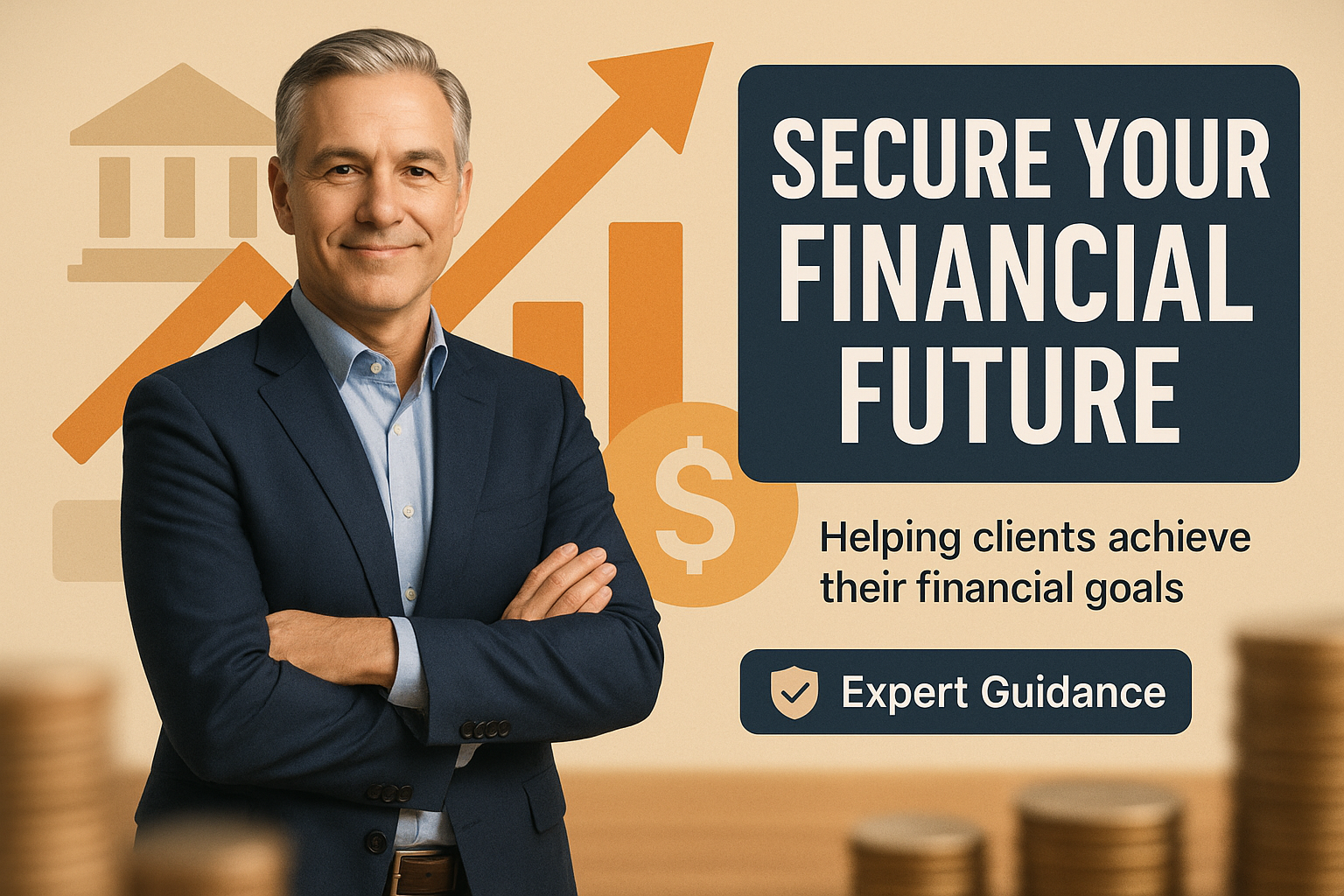 /Collection: /by davooda/Type: PNG/Promotional graphic for financial advisory services featuring a confident advisor and visual elements like charts and coins, aimed at potential clients seeking guidance.