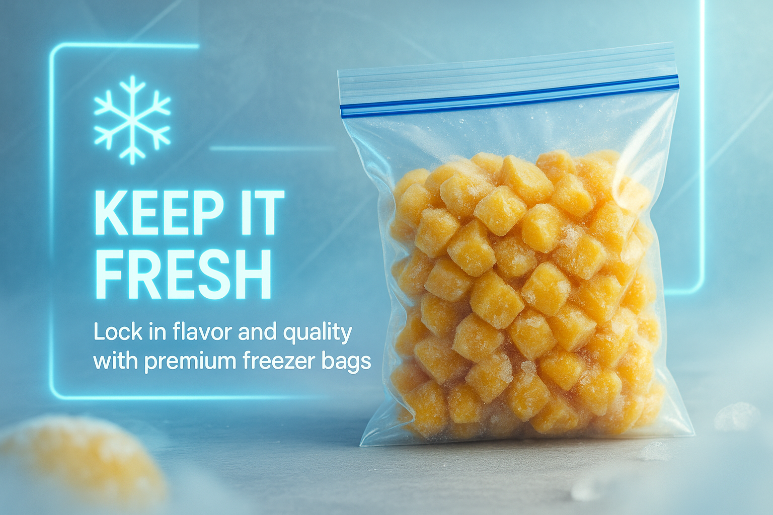 /Collection: /by davooda/Type: PNG/A visually appealing promotional image showcasing premium freezer bags filled with frozen cubes, emphasizing freshness and quality. Ideal for marketing food storage solutions.