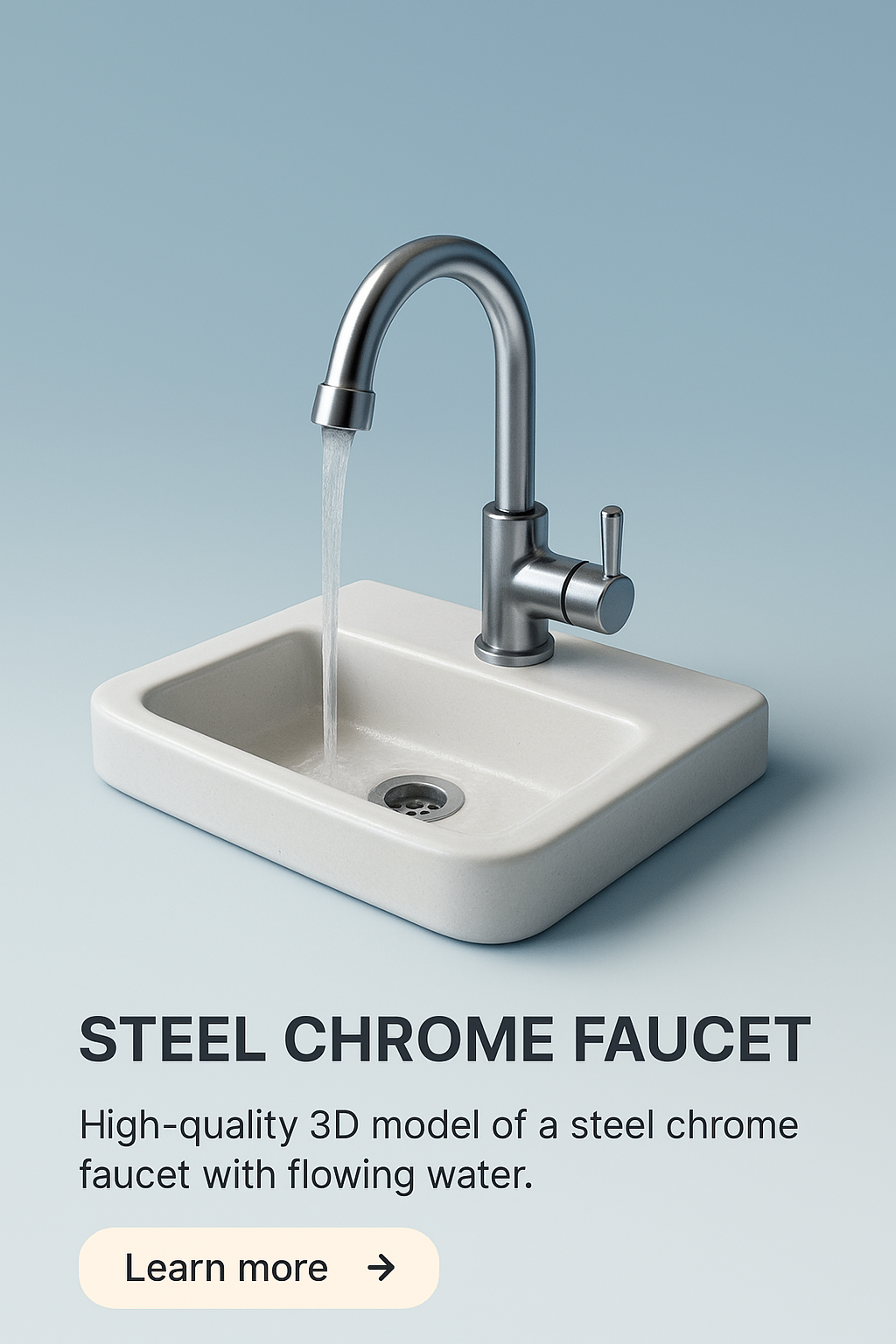 A high-quality 3D model of a steel chrome faucet with flowing water, set against a smooth gradient background. The scene captures a realistic depiction of the faucet and its surroundings.