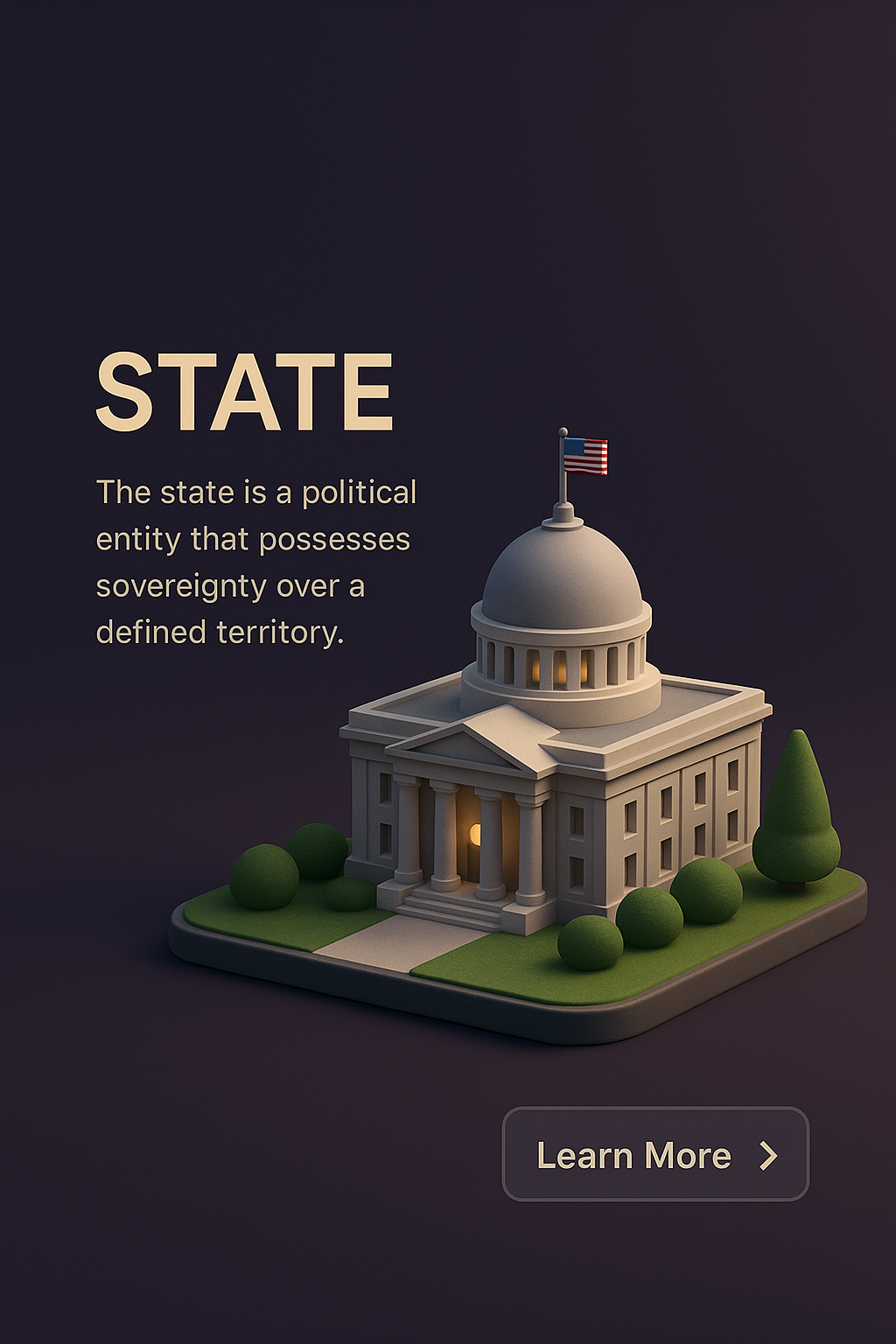 /Collection: /by davooda/Type: PNG/A minimalist 3D depiction of a state building on a dark gradient background, showcasing sovereignty. The scene includes a small building, text elements, and a call-to-action button.