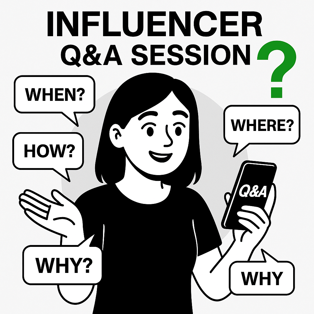 Engaging graphic depicting a character interacting with a smartphone during a Q&A session. The design features a minimalist style with speech bubbles, ideal for social media engagement.