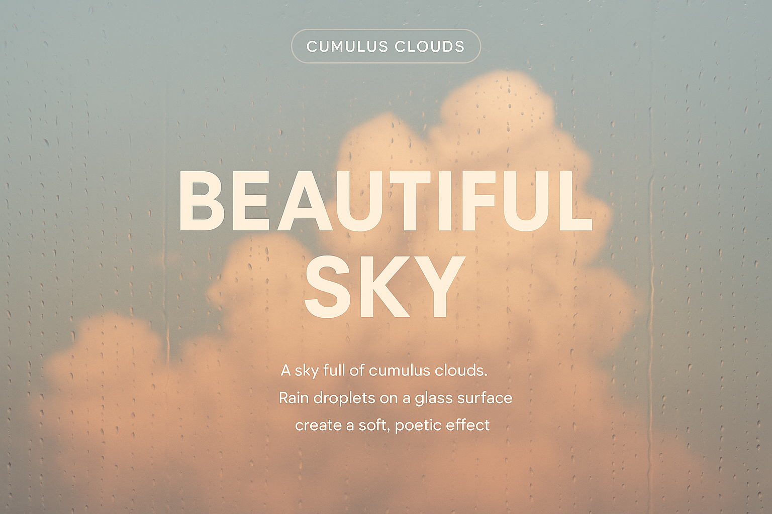An ethereal image showcasing cumulus clouds through a glass surface adorned with water droplets. The soft, pastel colors create a serene atmosphere, evoking a fresh, poetic mood.