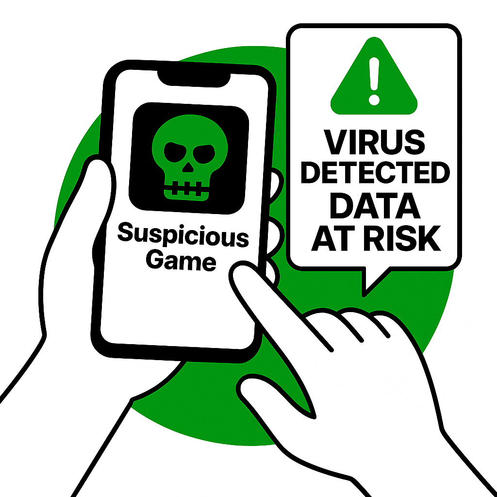 Illustrative graphic depicting a smartphone displaying a warning about a potential virus threat, aimed at raising awareness about mobile security risks.