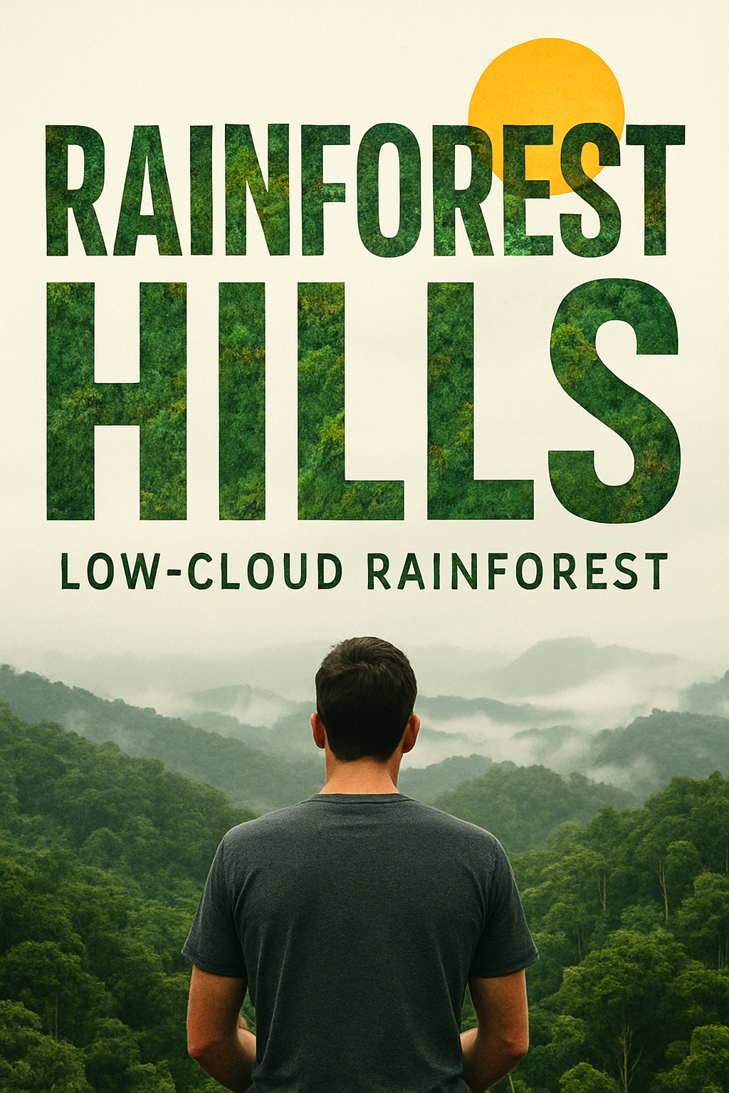 Artistic landscape poster depicting a person gazing at lush rainforest hills under a low cloud cover, perfect for nature-themed decor or travel promotions.