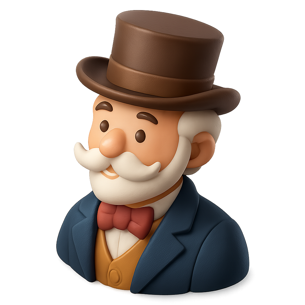 A whimsical 3D icon of an aristocratic figure, showcasing a character with a top hat, bowtie, and a formal coat. The icon features a transparent background and a volumetric, isometric design.