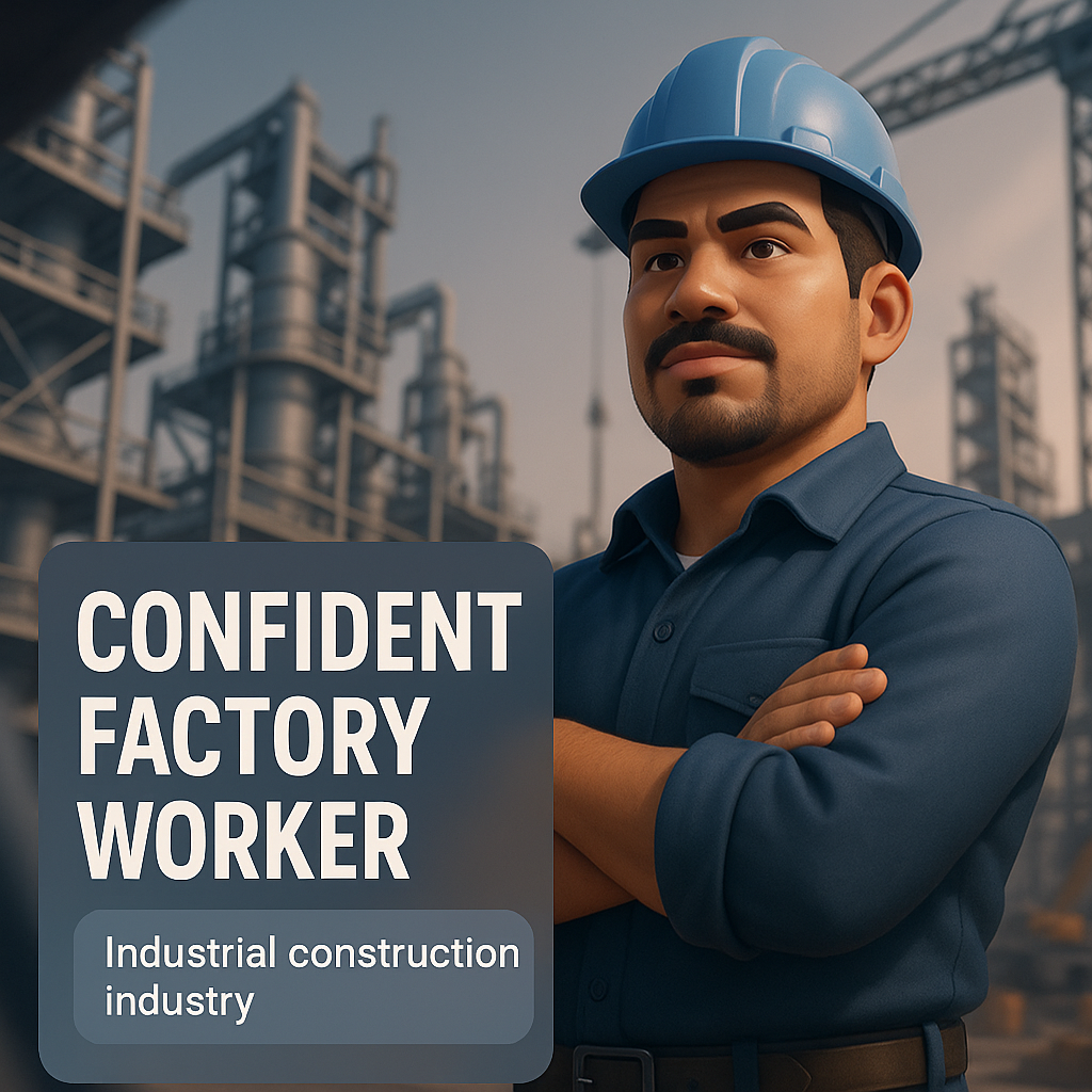 /Collection: /by davooda/Type: PNG/A 3D illustration depicting a confident factory worker in an industrial construction environment, showcasing professionalism and determination. Ideal for industry-related content.