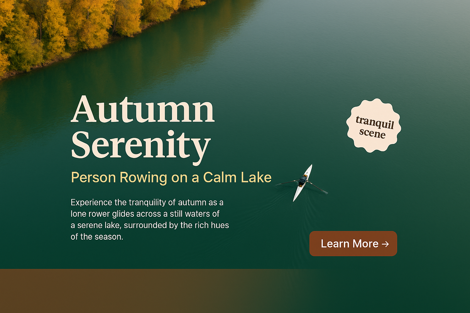 A tranquil autumn scene featuring a lone person rowing on a still lake. The serene water reflects the rich hues of the season, creating a peaceful atmosphere.